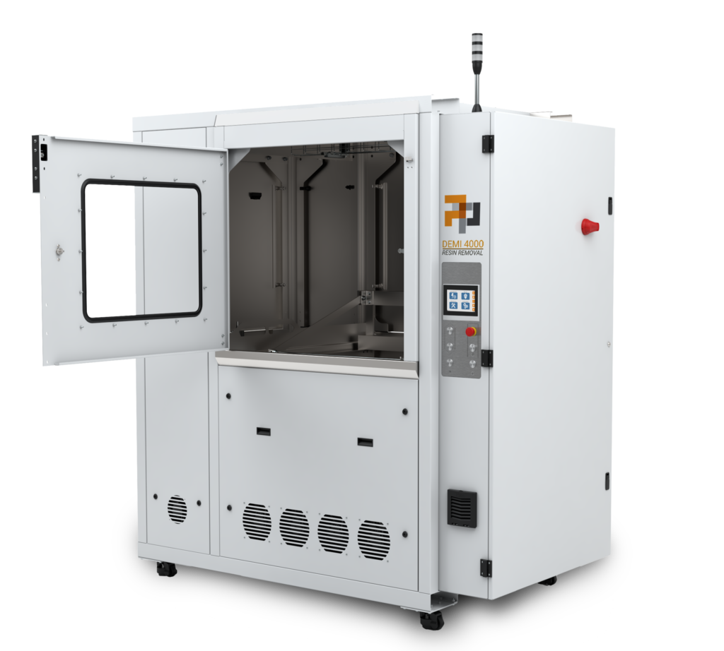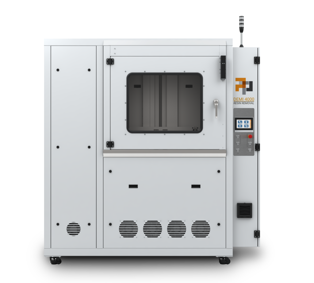 Measuring 890mm x 890mm x 635mm, the DEMI 4000’s tank is designed to hold 275 gallons of resin removal chemistry. At this size, the tank can handle heavy loads of parts at one time, effectively increasing throughput and improving cycle times for all part sizes. Additionally, as a fully-enclosed system with a ventilation port, the DEMI 4000 ensures safety for operators and manages the work environment to control fumes and contain resin and detergent.